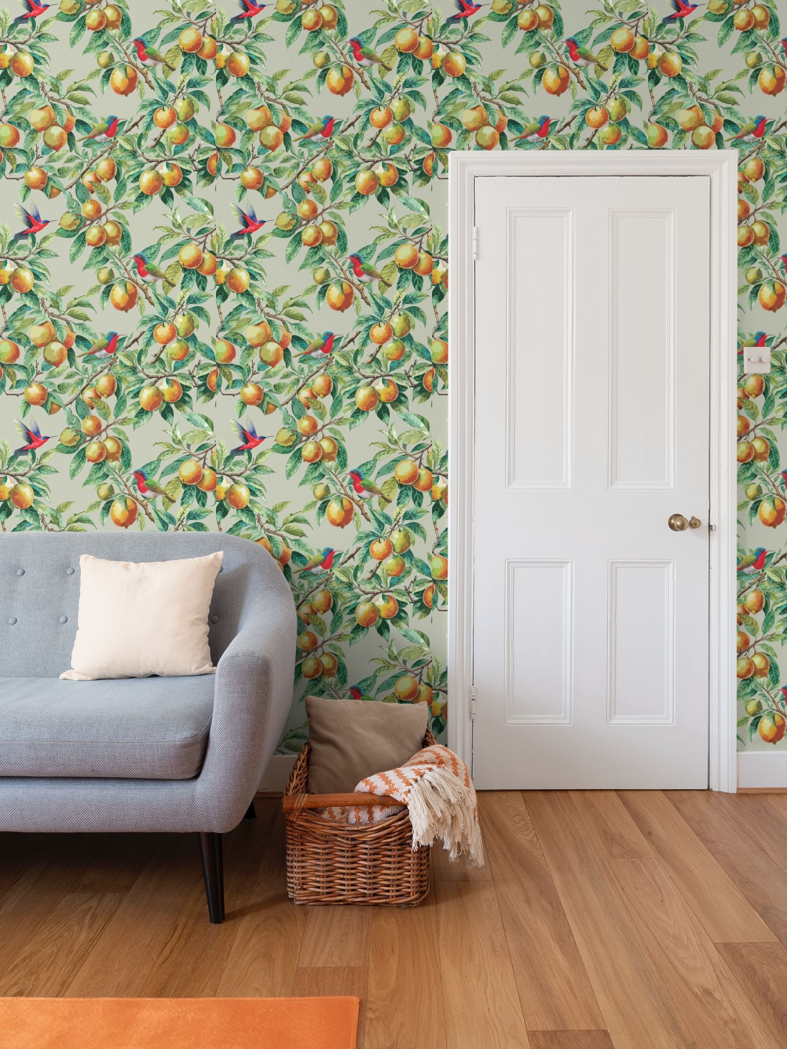 This beautiful citrus print will bring a flavor of the tropical indoors when you can't be out among it. Featuring a hand-illustrated rendering of citrus fruit on boughs with beautiful sunbirds darting among the branches.