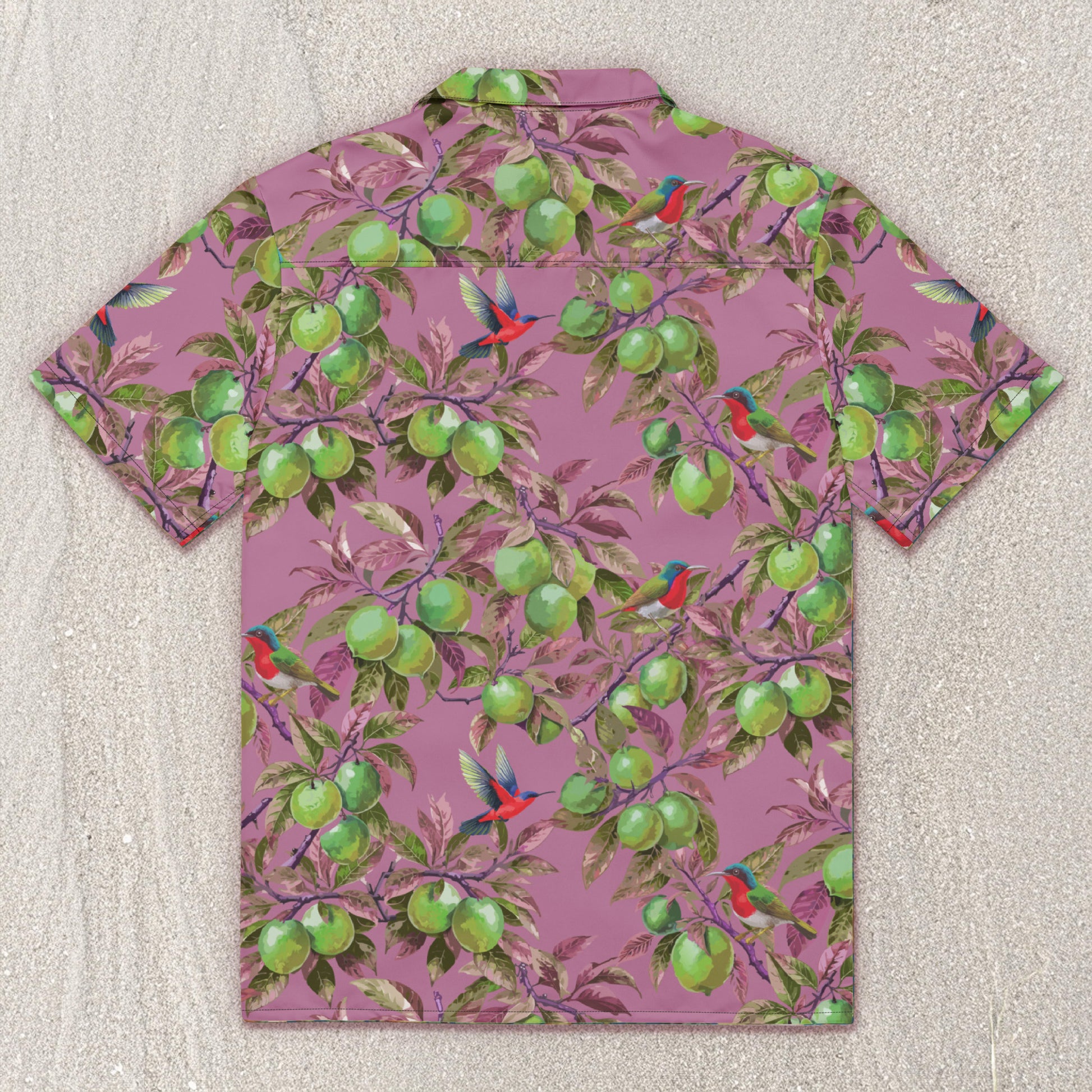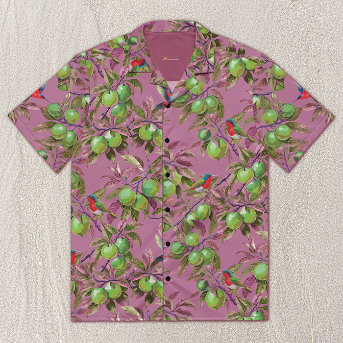 - Artist-created citrus grove pattern with tropical birds