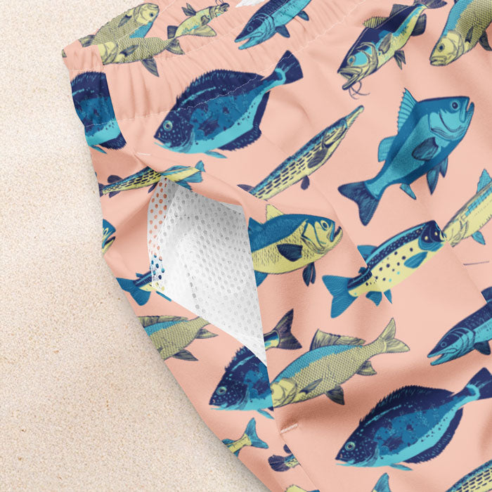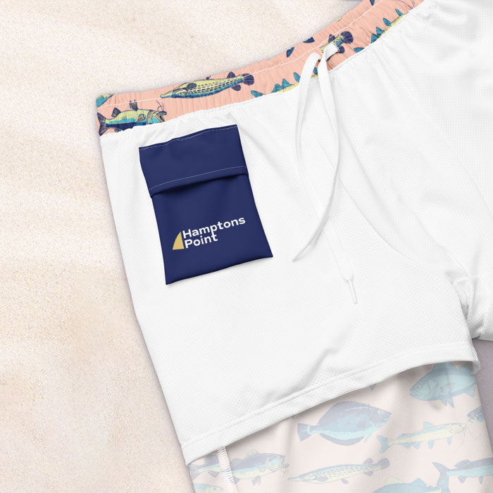 These swim trunks celebrate the bounty that every angler dreams about—featuring detailed illustrations of prized fish from striped bass to flounder, bluefish to sea trout. Each species represents the kind of catch that makes for legendary fishing stories and well-stocked dinner tables. They're everything needed for a hot summer day—they’re quick-drying and breathable, have multiple pockets, and feature a silky, anti-chafe inner liner.
