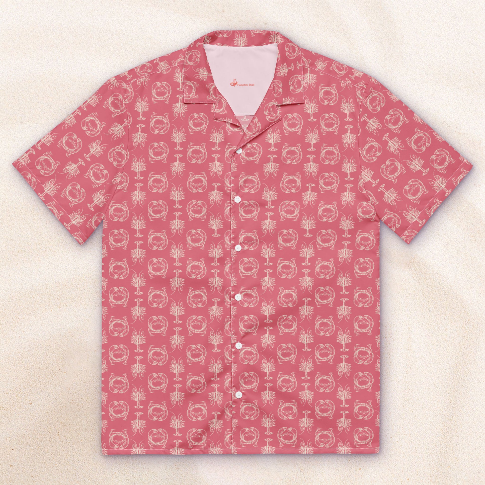 A repeat pattern of vintage crab and lobster engravings — the kind you'd find in a 19th century naturalist's field guide — printed fresh across seven colorways. The cream version pairs blue crabs with pink lobsters for a two-tone take. The rest keep it clean — one color, one attitude.