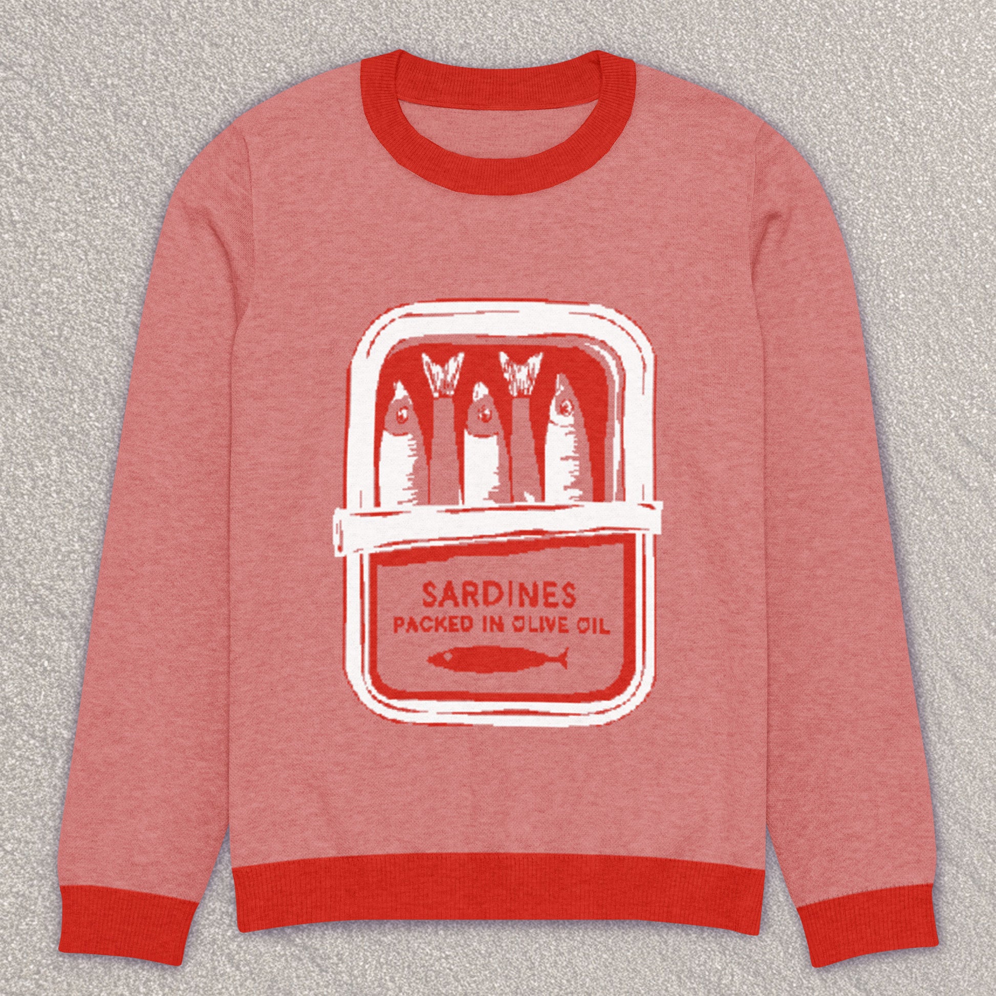 The hand-illustrated sardine tin design captures that perfect retro charm of classic Mediterranean fishing culture, while the soft coral and pink colorway with contrasting red ribbing creates a contemporary look that works well beyond the dock. It's the kind of sweater that sparks conversations about sustainable fishing, quality ingredients, and why tinned fish has become surprisingly trendy.