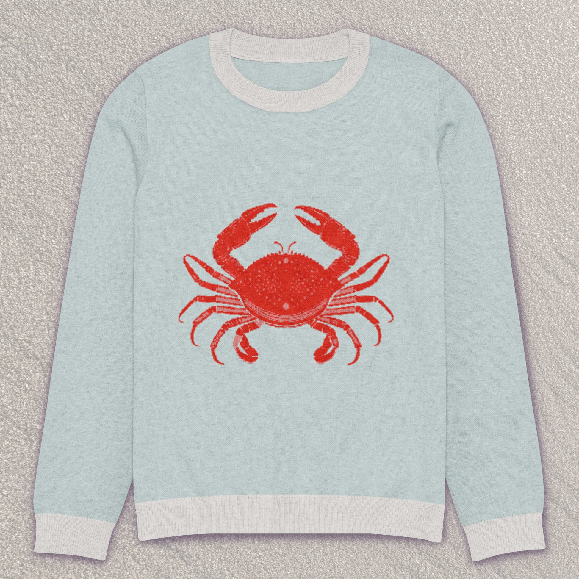 This hand-illustrated crab graphic celebrates the maritime harvest that defines Atlantic shore life. The vibrant red-orange crab pops against soft seafoam with cream contrast ribbing—a fresh, coastal palette perfect for waterfront living.
