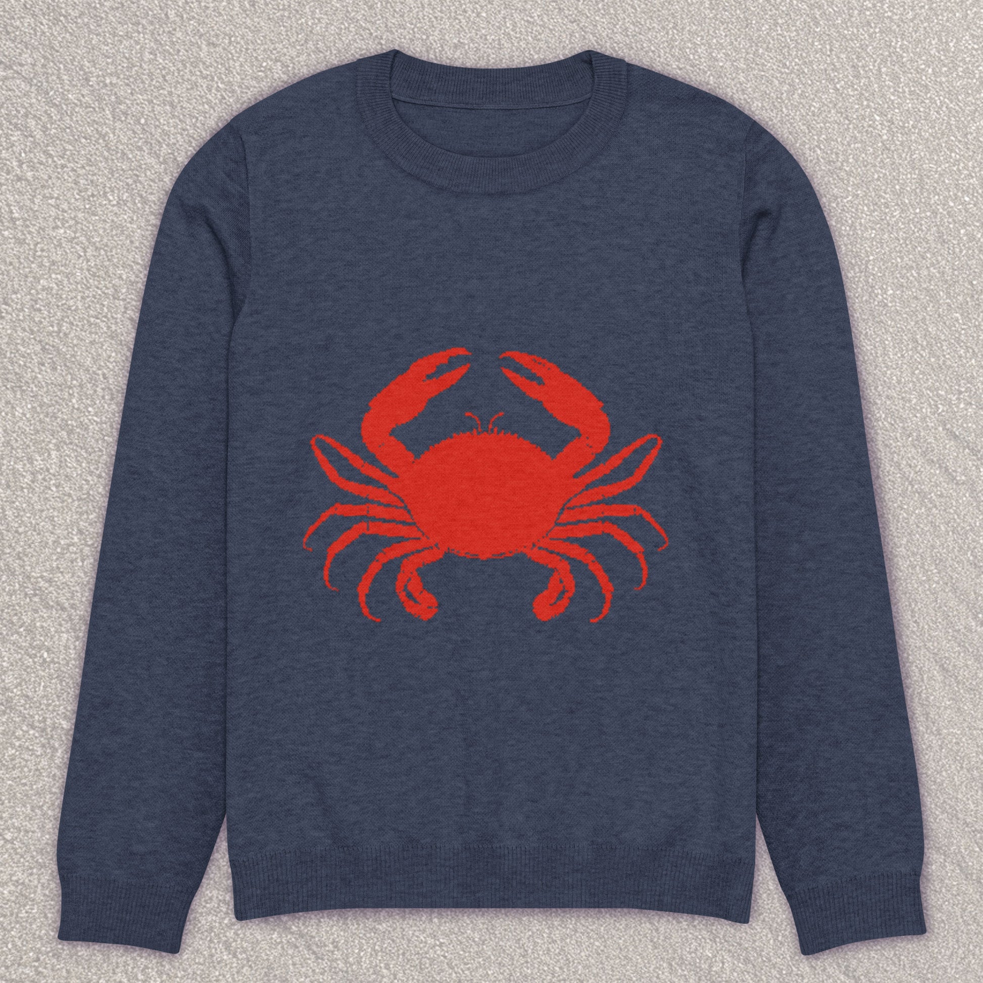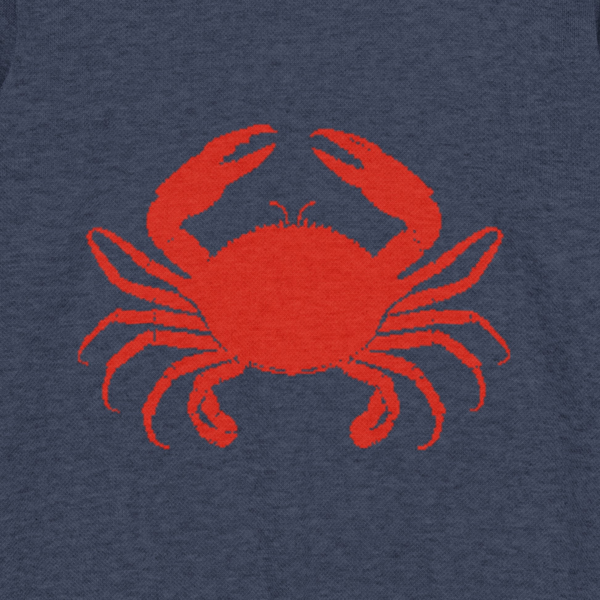 This hand-illustrated crab graphic celebrates the maritime harvest that defines Atlantic shore life. The bold red-orange crab stands out against rich navy—a timeless nautical palette that works from crab shack to yacht club.