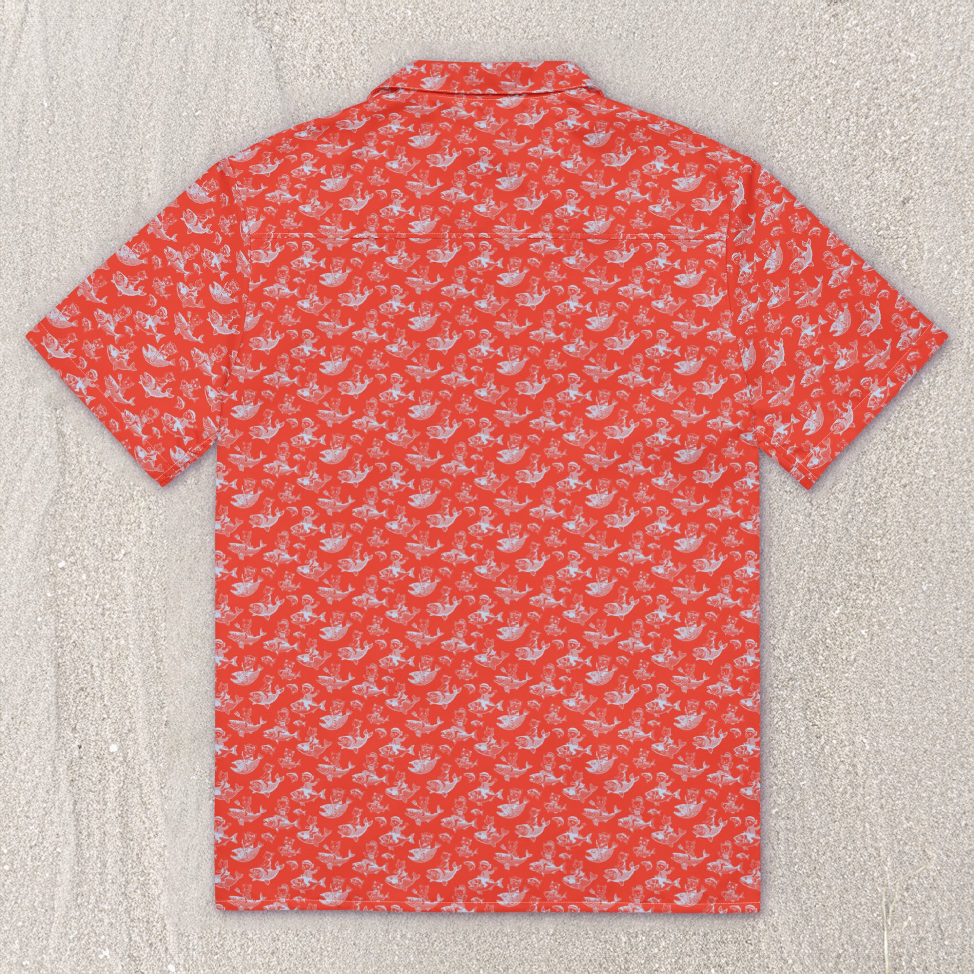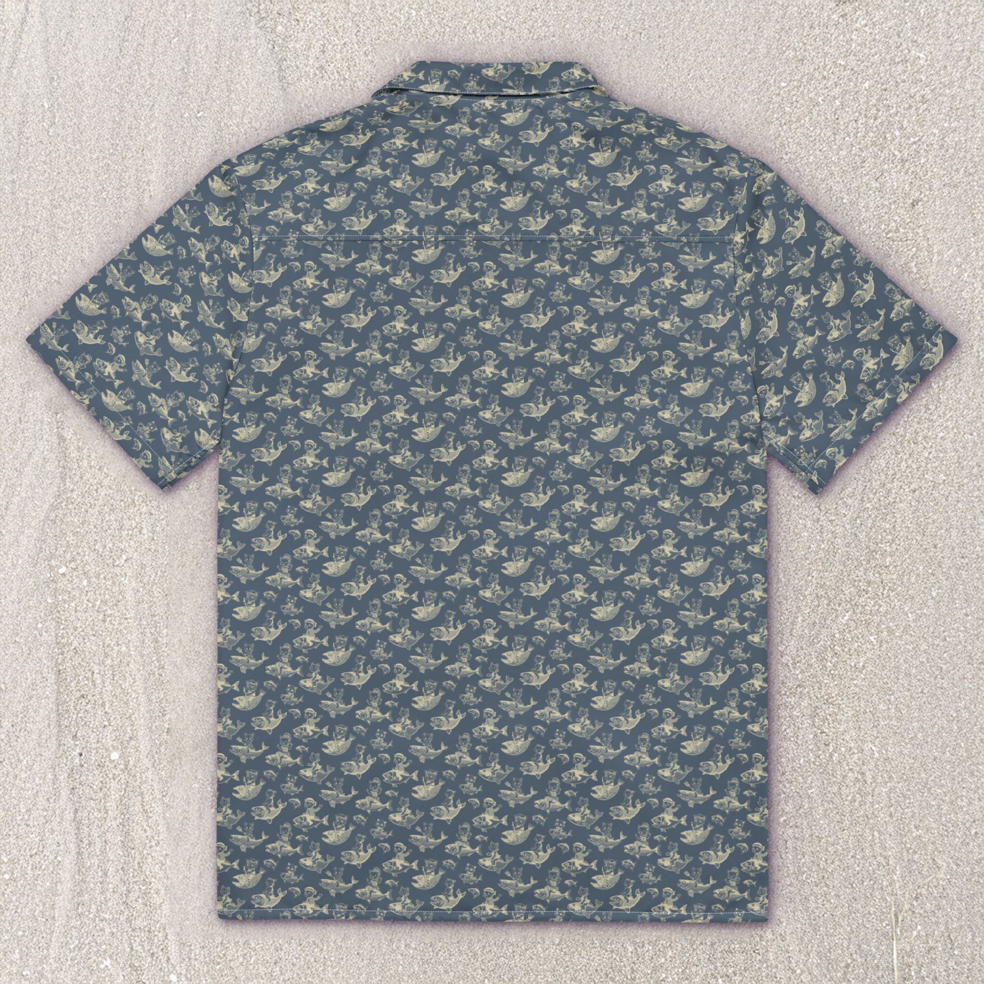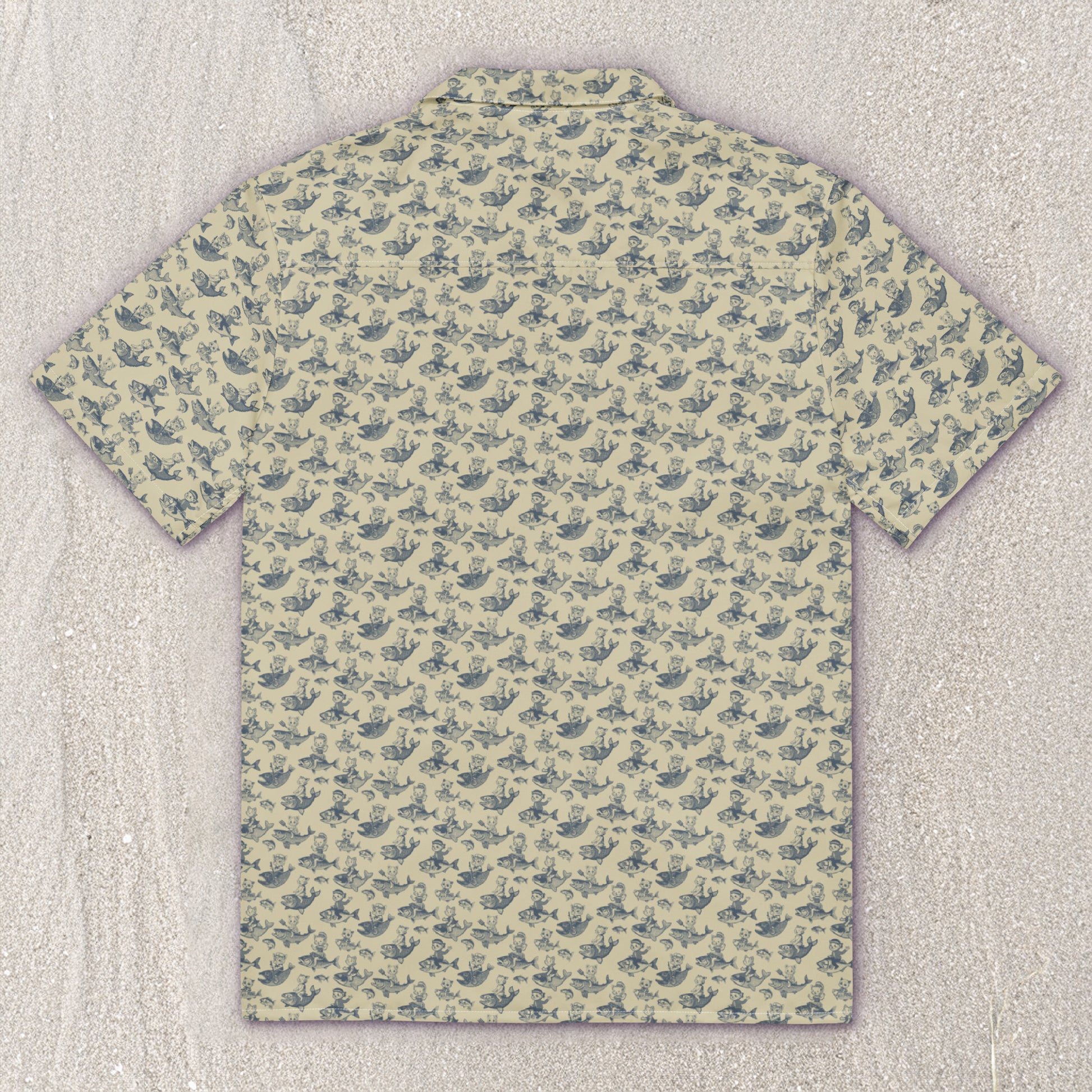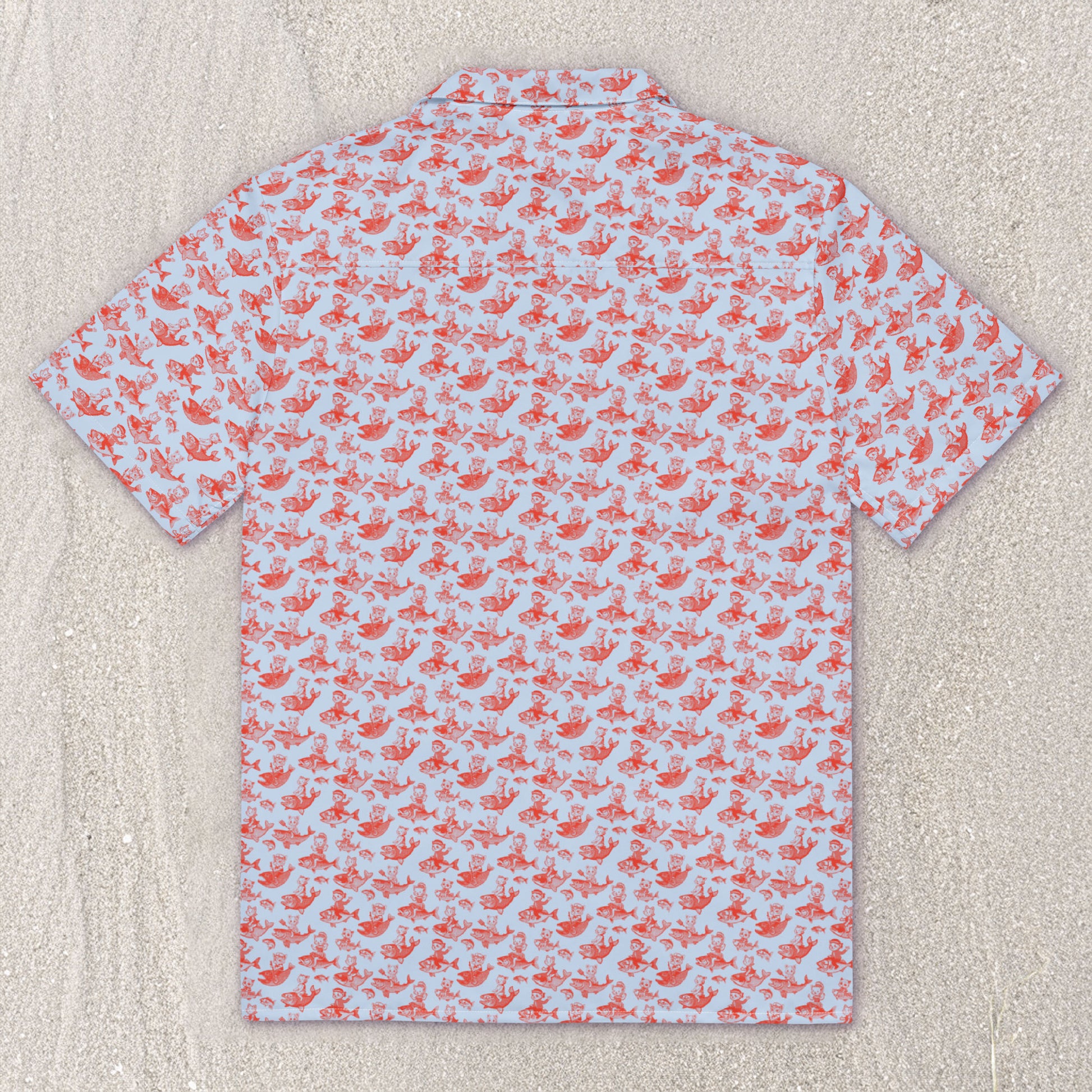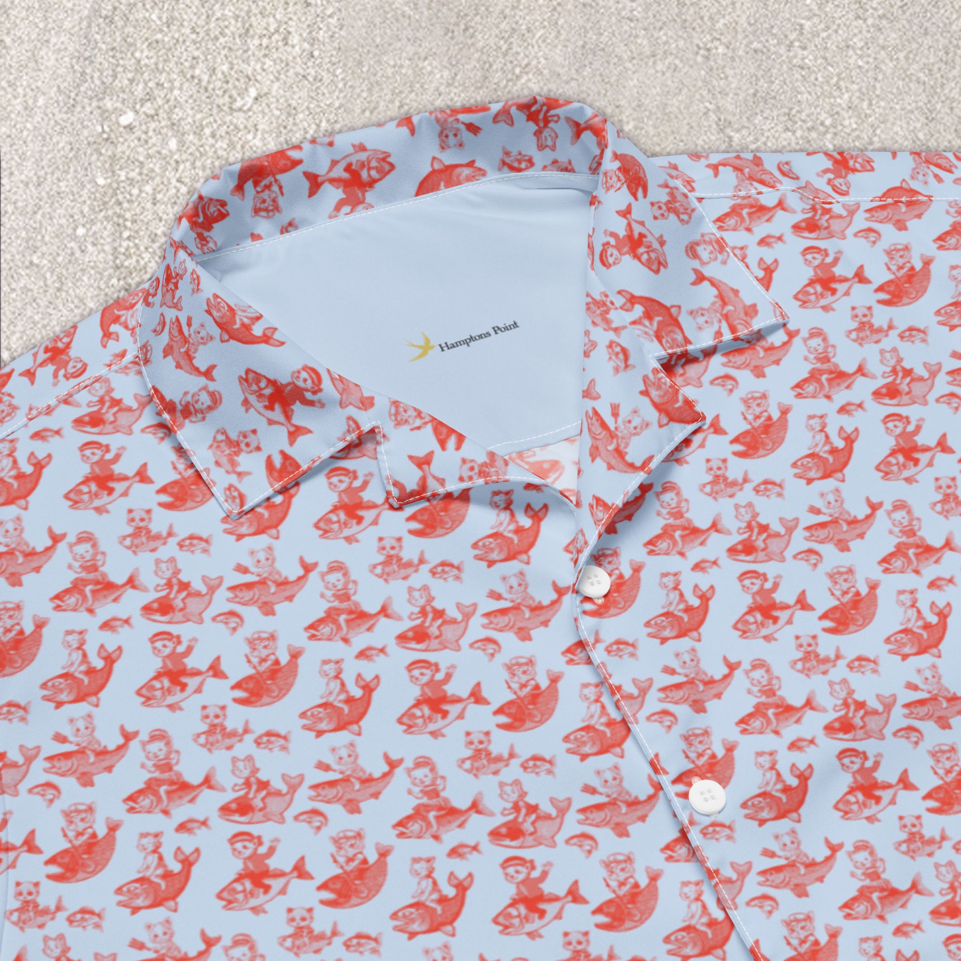 Meet your new favorite summer shirt—featherlight, breathable and built for long days on the water. An all-over nautical pattern celebrates a playful fleet of feline navigators riding fish with maritime flair, while performance-focused fabric keeps you cool and comfortable when the sun is high and the sea breeze is low.